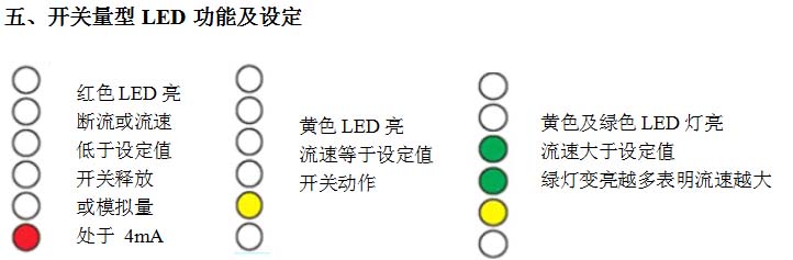 將流量開關(guān)裝好,使介質(zhì)以需要監(jiān)測的流速流動,擰開面板上的螺絲,調(diào)整電位計, 使第一個綠色LED怡好變亮。此后當流速低于當前值時,開關(guān)就釋放(紅燈亮)。若要使開關(guān)點比當前流速小,可調(diào)整電位計(順時針旋轉(zhuǎn)螺絲刀)使綠色 LED多亮一些。