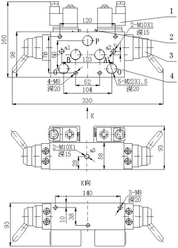 O---通往排氣口,&nb, sp; K向圖中的140(以中心線各70mm)、38的三個孔均為安裝固定的M8螺絲孔.