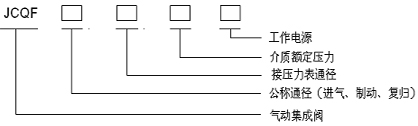 例1:JCQF-10-8-0.8-DC220表示氣制動集成閥的公稱通徑為10mm,到壓力表的管內(nèi)徑為8mm,介質(zhì)額定壓力為0.8MPa,工作電源為直流DC220