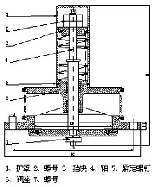 用螺絲刀旋開序號5的兩個緊定螺釘,拆開序號1護罩,按開啟真空度要求,固定序號4軸,松開序號2螺母,調整好擋塊,調完畢并緊定序號2螺母,蓋上序號1護罩,鎖緊序號5的兩個緊定螺釘。彈簧作用力在真空為5-10KPa時即能打開,當真空值超過20-30KPa時閥門全開,當閥門下部有水,靠水的浮力自動關閉。